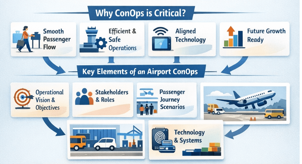 A Concept of Operations is a high-level document that describes how an airport or its systems will operate in real-life conditions. It captures the needs and expectations of passengers, airlines, regulators, and airport staff in a clear and structured manner.